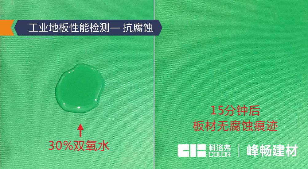 在工業地板上滴30%雙氧水,15分鐘后,板材無腐蝕痕跡。除了雙氧水,10%的硫酸,25%的氫氧化鈉溶液,滴在地板上也無腐蝕痕跡。
