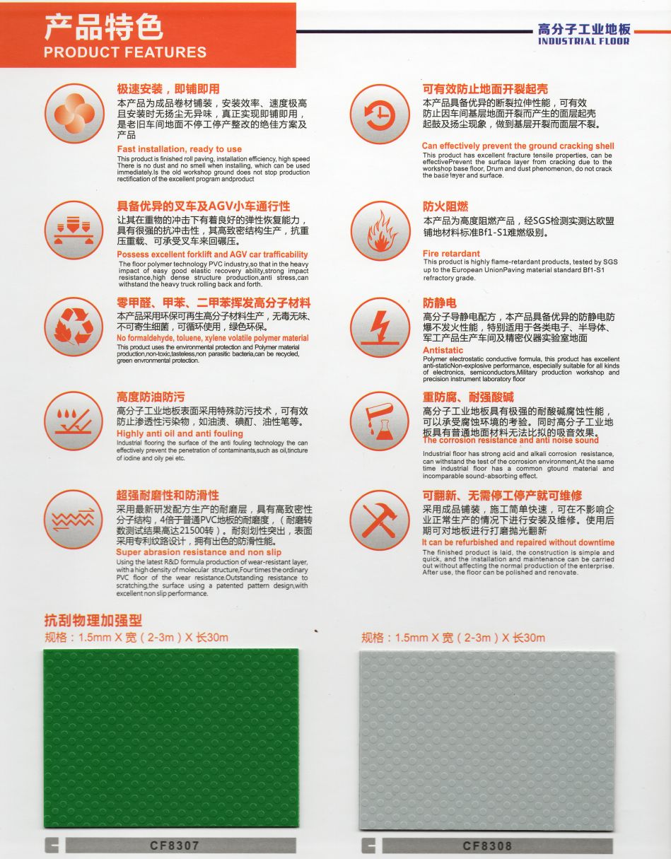 科洛弗高分子工業地板是一種采用高分子改性樹脂為原材料通過高溫熱壓成型的地板,此地板具備防油性、抗污性、抗腐蝕、防水防潮、施工工期短維修簡單、耐磨性好、抗靜電、重載、能過叉車、環保無毒、可回收再利用等優點!此產品的出現正好填補了市場快速發展帶來的空白,各項性能指標均衡且優異,可以逐步替代部份原有環氧地坪及各類水泥面工業地面,應用將逐漸增大,市場前景廣闊。