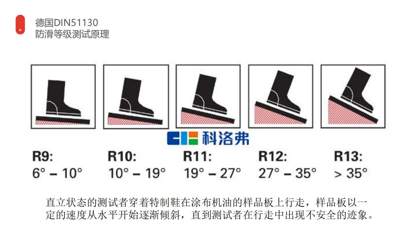 采用德國防滑標準生產(chǎn),經(jīng)德國油濕地面防滑標準DIN51130測試達R10防滑等級